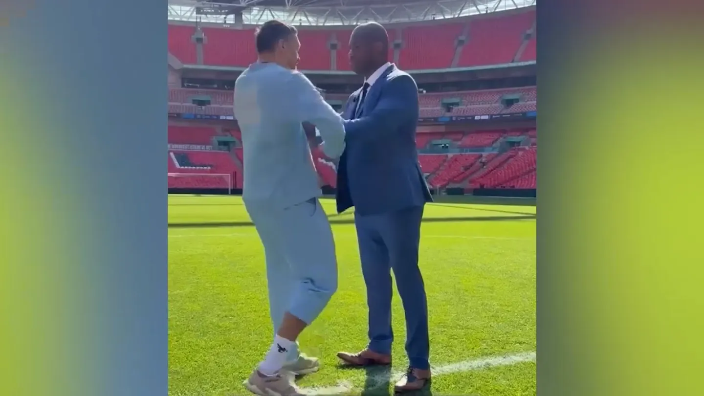 Y hoy, antes de su monumental choque por el título indiscutido, se vieron las caras en el césped del Estadio de Wembley, en su primer careo previo a la revancha.